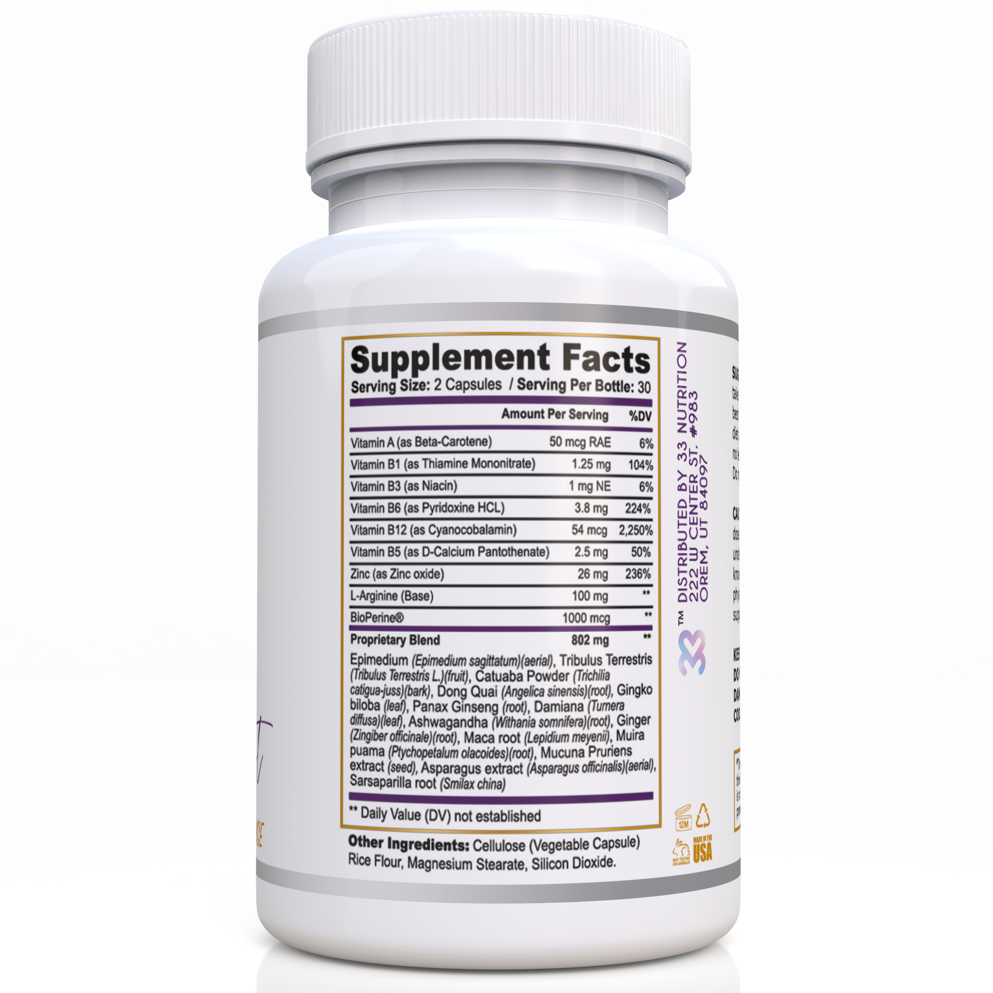 Epimedium, Tribulus Terrestris, Catuaba Powder, Dong Quai, Gingko biloba, Panax Ginseng, Damiana, Ashwagandha, Ginger root, Maca root, Muira puama, Mucuna Pruriens extract, Asparagus extract, Sarsaparilla root.